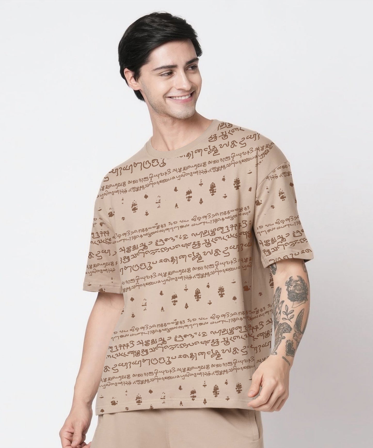 Unleash the power of Tamil heritage with the Kalvettu Themed Oversized Tamil T-Shirt Coord Set in Beige Brown. This unique set draws inspiration from ancient Tamil stone inscriptions (Kalvettu), blending tradition with contemporary streetwear for a bold and cultural statement.